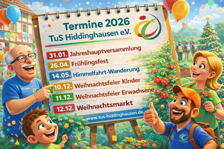 | traditionelle Himmelfahrtwanderung Strecke wird noch ausgearbeitet Der Kostenbeitrag für das Mittagessen ist bei der Anmeldung abzugeben. 15,00 Euro (Vereinsmitglieder) 25,00 Euro (Nichtmitglieder) Anmeldung in den Abteilungen oder beim Sportwart Thomas Hildebrand sportwart@tus-hiddinghausen.de
