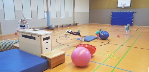 Kinder lernen viele verschiedene Sportgeräte und motorischer Grundtätigkeiten kennen: